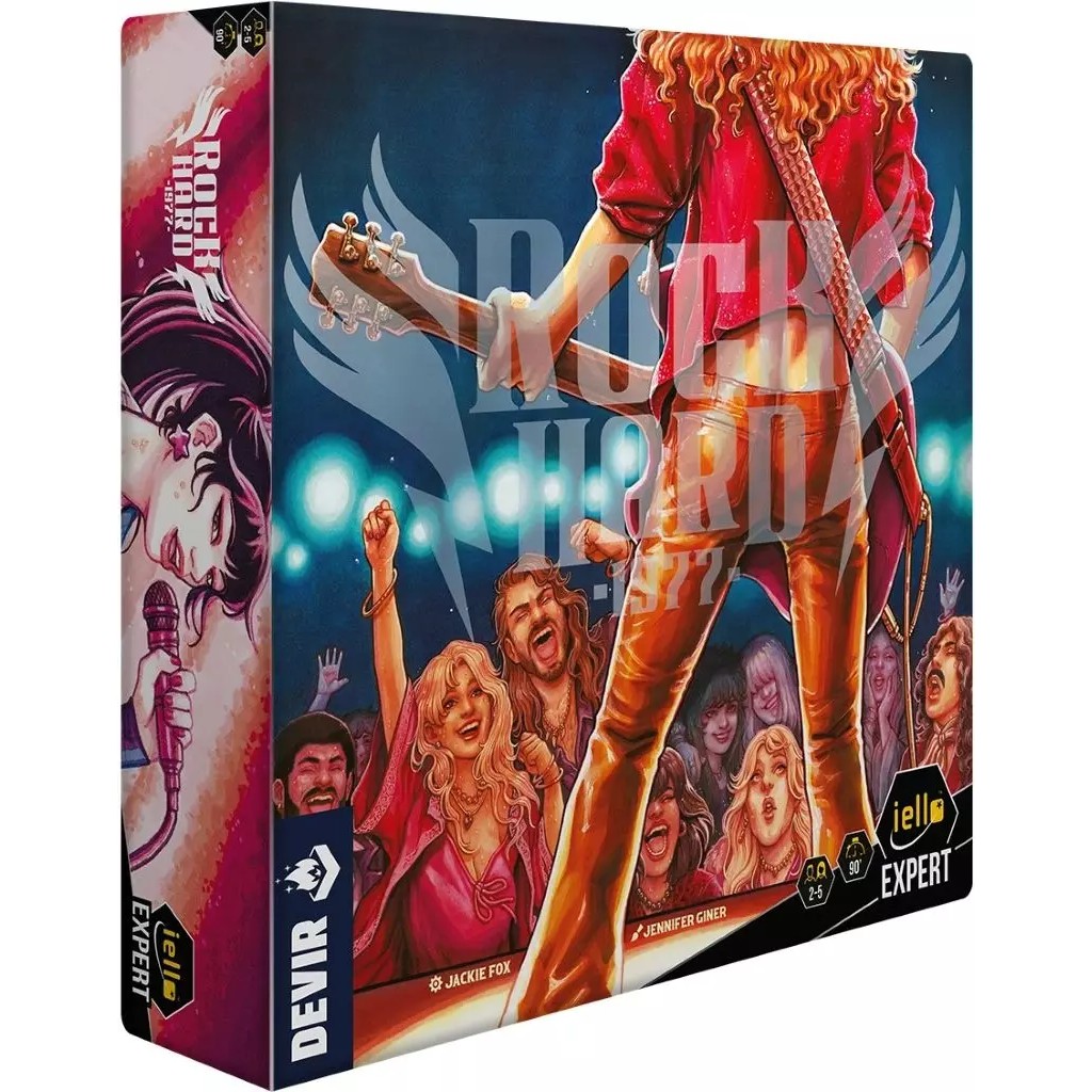 Nous sommes en 1977. Vous êtes un musicien prometteur et vous rêvez de succès avec votre groupe. Au cours des prochains mois, vous allez répéter, jouer, écrire des chansons et promouvoir votre groupe. Avec une planification minutieuse et un peu de chance, vous deviendrez plus célèbre que tout le monde et serez sacré artiste à succès de l’année. Vivez l’ascension d’une rock star ! Dans ce jeu de placement d’ouvriers, vous incarnez une rock star montante et vous affrontez pour accumuler le plus de points de renommée au fil des mois de l’année 1977. Chaque partie se joue en neuf manches maximum, chacune représentant une journée typique d’un mois, d’avril à décembre. Dans le jeu Rock Hard 1977, il faudra travailler votre réputation, améliorer vos compétences et peaufiner la qualité de vos chansons. Décrocher des contrats d’enregistrement et obtenir des royalties vous permettra d’assurer votre ascension, tout comme jouer dans les clubs les plus branchés et remplir les salles mythiques. En multipliant les performances, en peaufinant votre promotion et en saisissant les bonnes opportunités, vous progresserez vers la consécration. Mais l’industrie musicale est exigeante : vous pourrez faire appel à un manager pour vous aider à booster votre carrière, à condition de pouvoir vous offrir ses services. Chaque manager possède une capacité spéciale qui vous offrira des avantages stratégiques. Parfois, un rocker a besoin d’un petit coup de pouce pour tenir le rythme effréné de la scène. Les joueurs peuvent consommer des bonbons pour prendre un tour supplémentaire et effectuer plus d’actions… mais gare aux excès ! Une trop grande consommation pourrait provoquer une surdose de sucre et compliquer votre parcours vers le sommet. Rock Hard 1977 brille par son design immersif et son matériel haut de gamme. Les plateaux individuels sont pensés comme des amplificateurs, avec des potentiomètres fonctionnels servant de marqueurs. Les jetons d’ordre du tour prennent la forme de véritables médiators, tandis que les billets de jeu ressemblent à de vrais dollars, renforçant encore davantage l’atmosphère rock’n’roll du jeu. Dès les premières manches, les joueurs ressentent une progression constante. Il faut jongler entre un job alimentaire et les premiers concerts dans des petits bars, avant d’accéder aux grandes scènes et de marquer l’histoire du rock. Chaque partie est différente grâce aux nombreuses cartes d’événements qui pimentent le jeu et aux capacités uniques des rockers et des managers. Entre planification stratégique, prises de risque et choix audacieux, une seule question demeure : êtes-vous prêt à devenir une légende du rock ? Une chose est sûre : ça va partir en live ! Conçu par la légendaire rock star et passionnée de jeux de société Jackie Fox (ancienne membre du groupe The Runaways) et illustré par Jennifer Giner, Rock Hard 1977 est un jeu compétitif pour 2 à 5 joueurs, à partir de 14 ans, avec des parties dynamiques de 45 à 90 minutes.